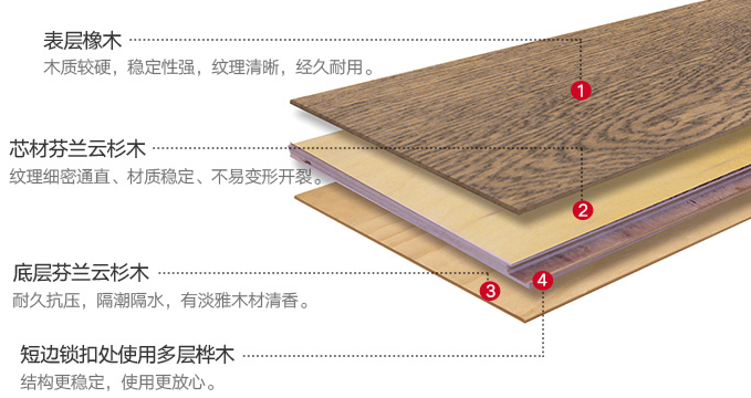分为三层和多层,通常用面层树种来确定地板的名称,比如“橡木实木复合地板”就是表层用橡木,底层用杉木、桦木之类的便宜木头。
