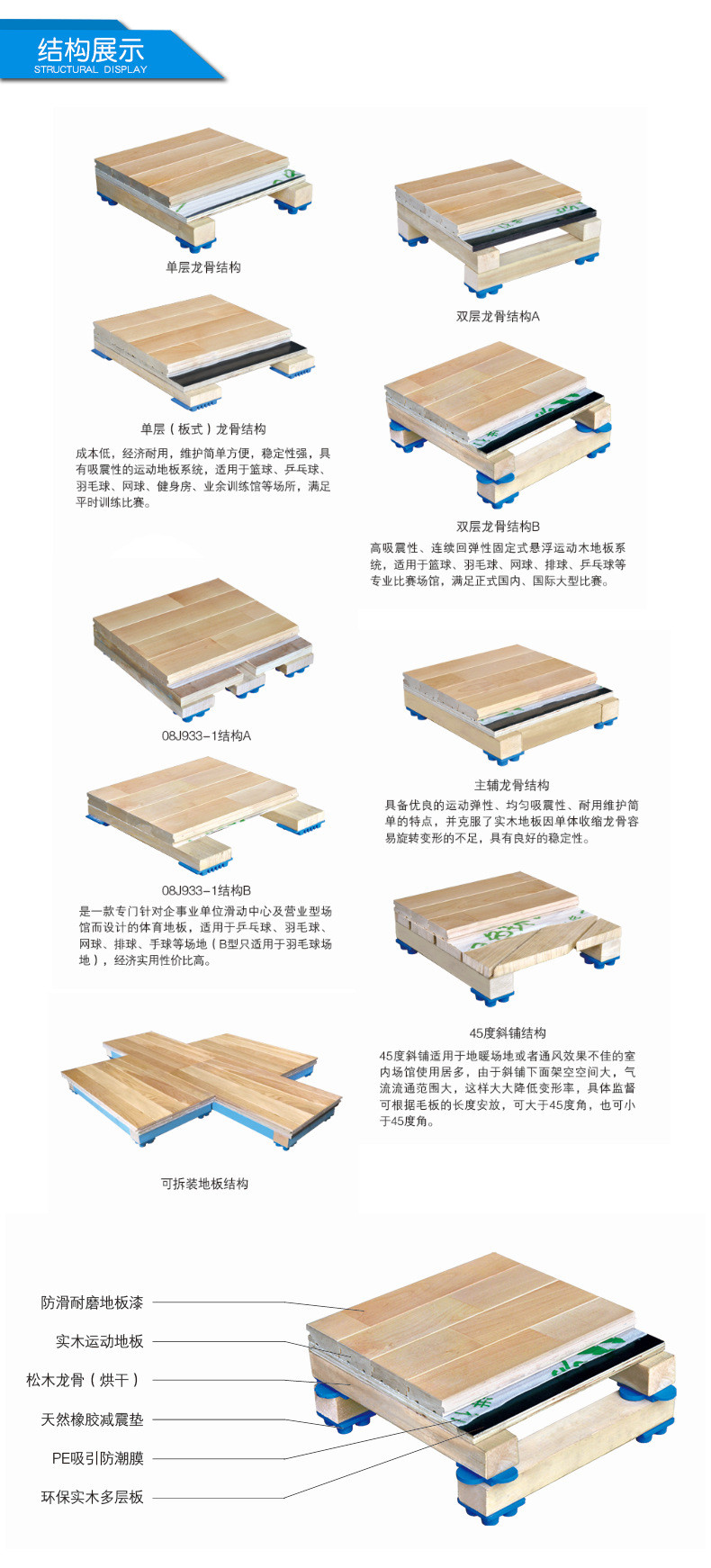 面板介绍: 专业篮球场木地板,羽毛球场木地板,乒乓球场木地板,参照德DIN标准,结构标高100mm完全满足运动木地板的保护功能、运动功能、技术功能,适用于各类教学训练。